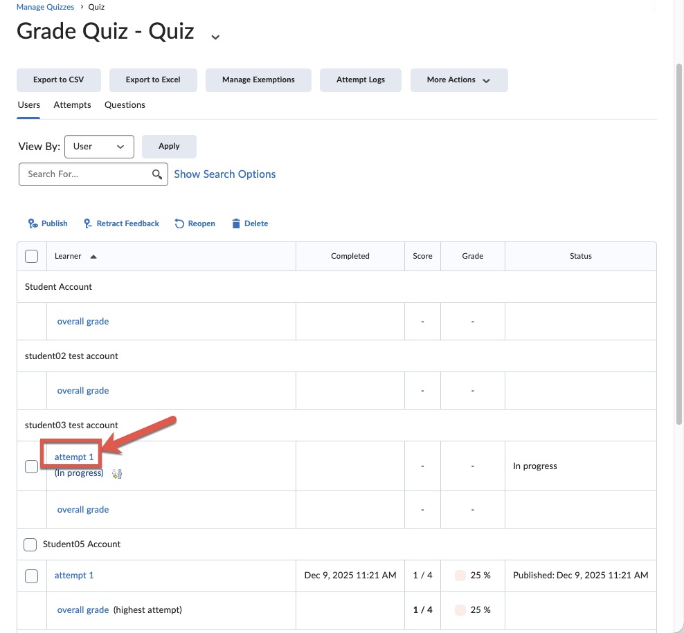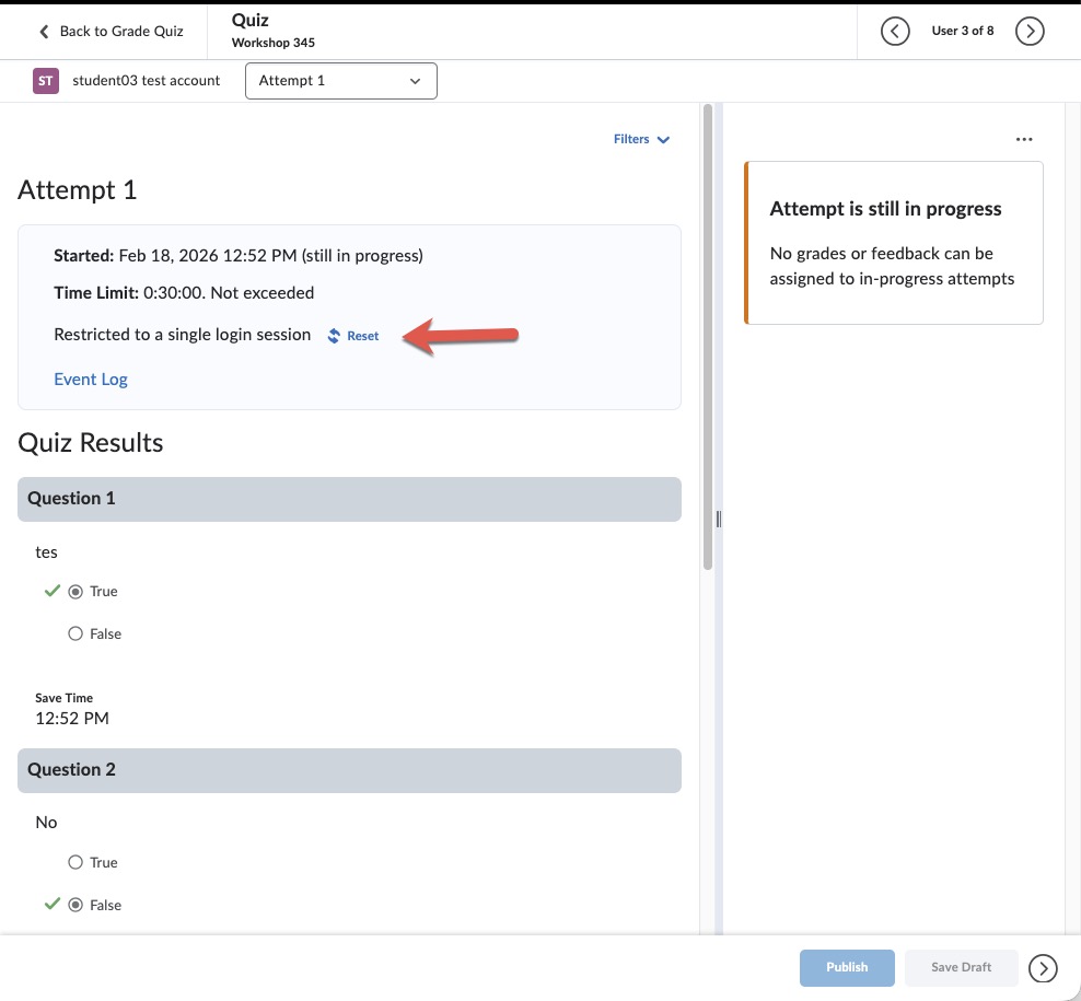 If you need to manually reset the restriction for students to continue their attempt, if more than one session for the quiz was started – go to manually grade the quiz, and click on the users’ attempt: