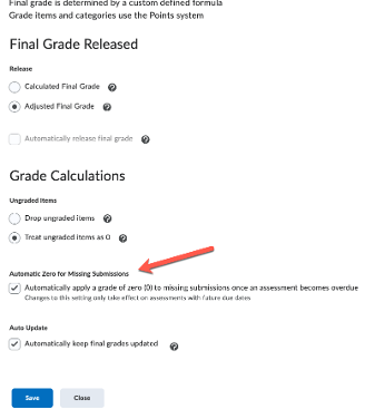 • Automatic zero grades apply to special access due dates. In the event special access is added after the original due date, the original 0 grade remains in place until the activity is evaluated manually.
